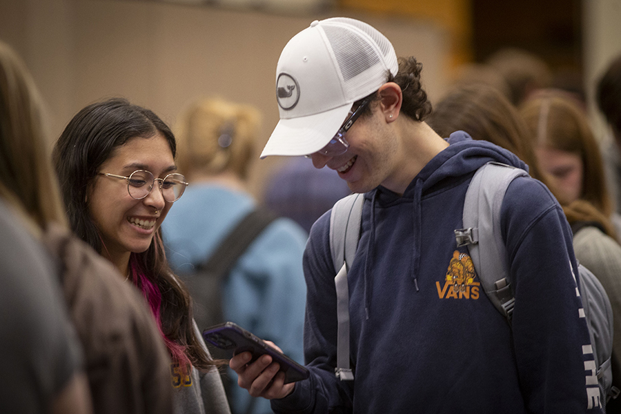 Two students smile together as they look at a phone.