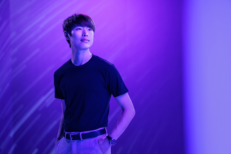 A person in purple lighting.